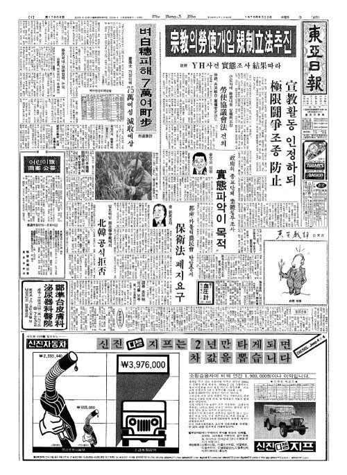 - 金(김) 新民(신민)총재 都産(도산)·카톨릭農民會(농민회) 탄압중지 保衛法(보위법) 폐지요구