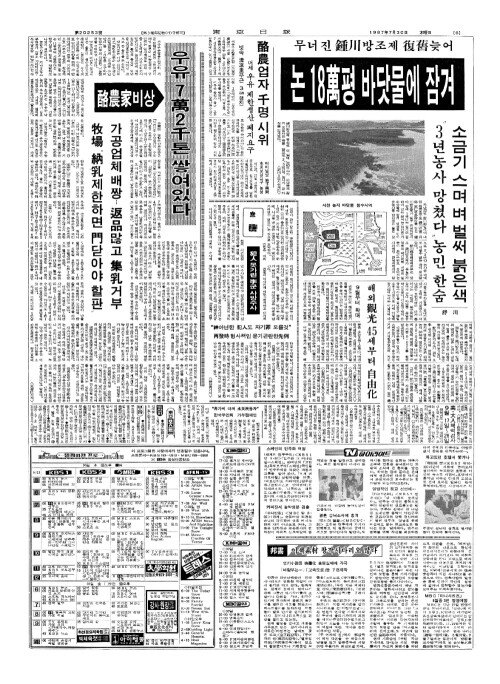 - 논 18萬(만)평 바닷물에 잠겨 무너진 鍾川(종천)방조제 復舊(복구)늦어