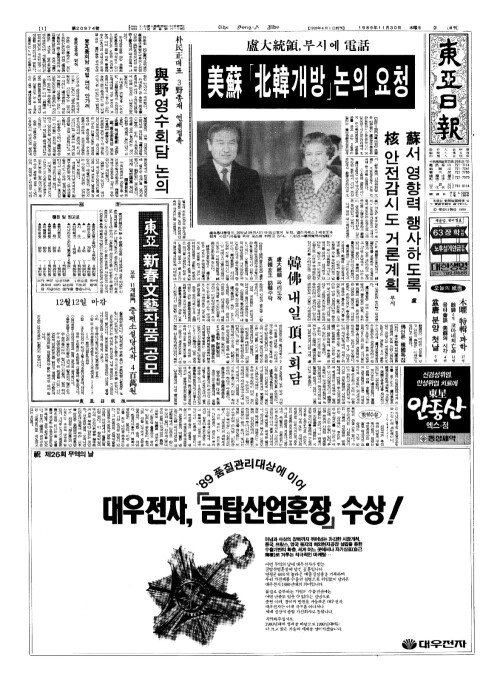 - 盧大統領(노대통령),부시에 電話(전화) 美蘇(미소)「北韓(북한)개방」논의 요청