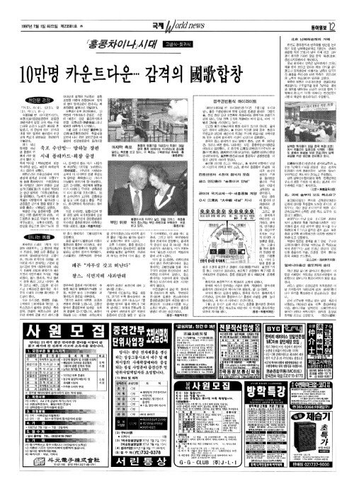 홍콩 대륙속으로 中(중) 주권인수「홍콩차이나」시대 개막