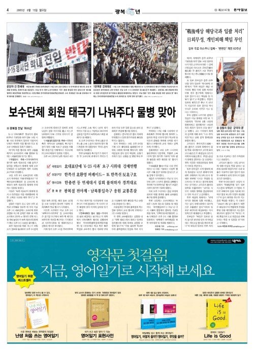 [사회]광복절 전날 `어수선`…보수단체 회원 태극기 나눠주다 물병 맞아