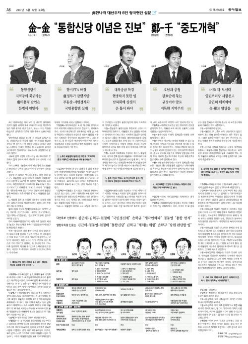 金-金 “통합신당 이념은 진보” 鄭-千 “중도개혁”