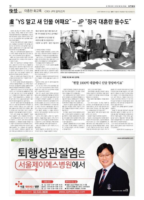 盧 “YS 말고 새 인물 어때요”… JP “정국 대혼란 올수도”