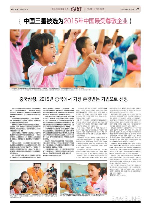 중국삼성, 2015년 중국에서 가장 존경받는 기업으로 선정