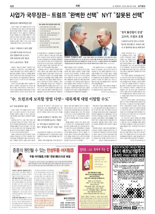 사업가 국무장관… 트럼프 “완벽한 선택” NYT “잘못된 선택”