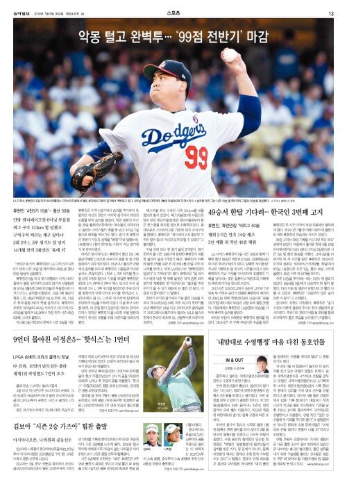 악몽 털고 완벽투… ‘99점 전반기’ 마감