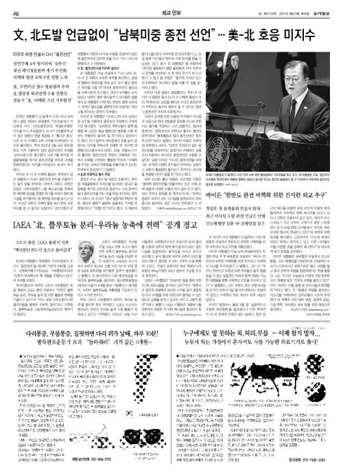 文 “한반도 종전선언”제안… IAEA “北 전속력으로 핵개발”
