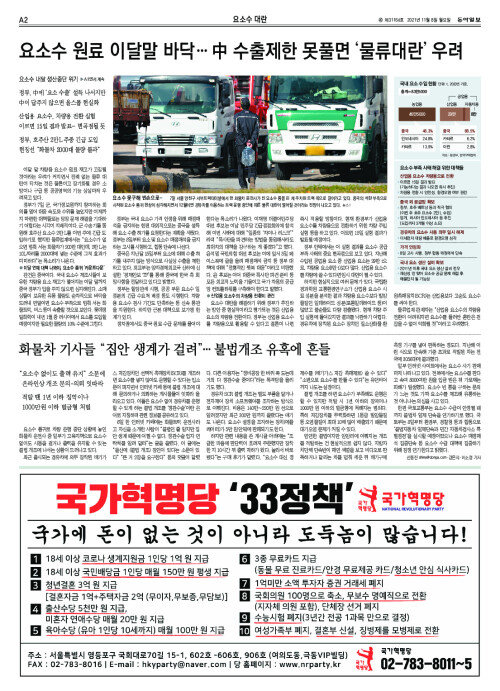 요소수 내달 생산중단 위기… 호주서 2만 L 긴급수입