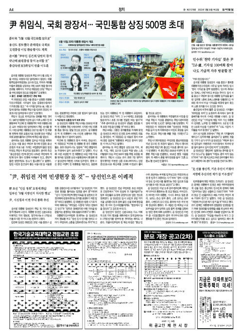 尹 취임식, 국회 광장서… 국민통합 상징 500명 초대