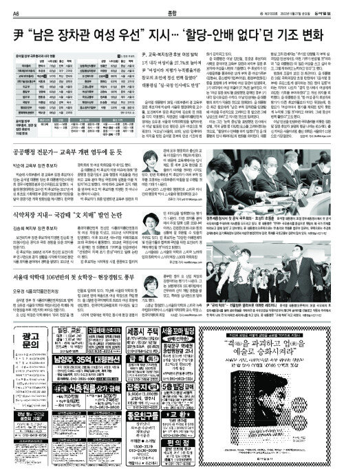 尹 “남은 장차관 여성 우선” 지시… ‘할당-안배 없다’던 기조 변화