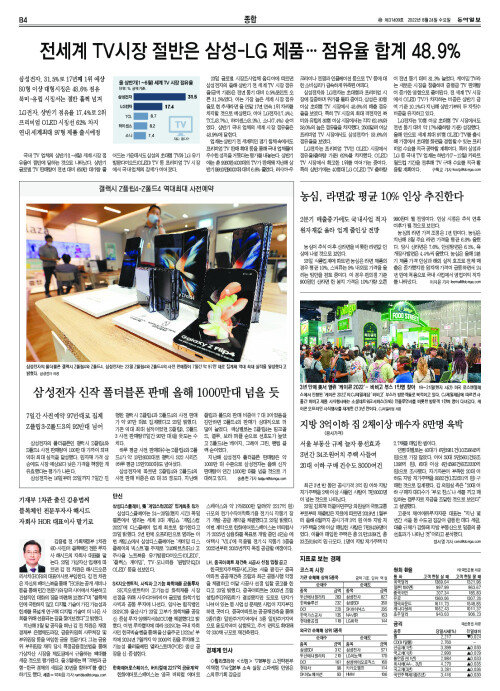 - 전세계 TV시장 절반은 삼성-LG 제품… 점유율 합계 48.9%