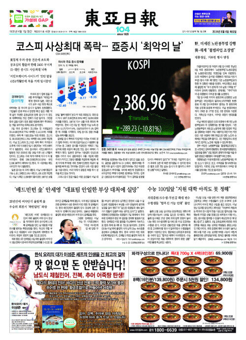 코스피 사상최대 폭락… 亞증시 ‘최악의 날’