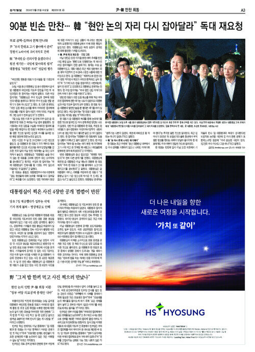 90분 빈손 만찬… 韓 “현안 논의 자리 다시 잡아달라” 독대 재요청