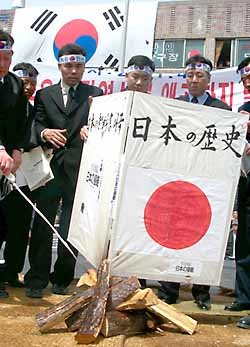 6日(周五)在蔚山举行的重现3·1万岁运动活动中,参加者正在燃烧日本教科书模型。