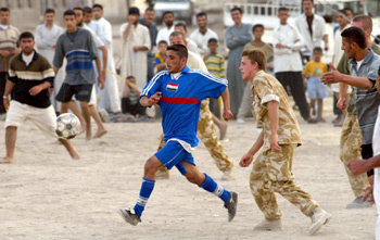 17日,在伊拉克麦迪纳地区的一个空地上,当地居民和英军正在进行足球比赛。