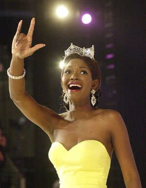 20日在美国新泽西州大西洋城举行的2004年美国小姐选拔赛上,来自佛罗里达的Erika Harold夺得美国小姐桂冠后用手指表示L和U字母(love you的第一个字母)来做出“我爱你”的手势。