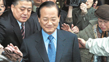 22日,表明在全党大会后让位之意的大国家党代表崔秉烈(中)在汉城汝矣岛党部结束记者招待会并安慰哭喊的支持者后,正在离开党部。崔秉烈的支持者们当天一大早来到党部高喊“是谁想害崔秉烈?”并指责了要求让位的各议员。