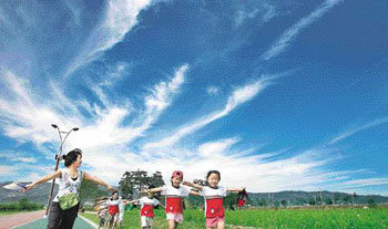 秋天的天空每天都在升高。1日在汉江市民公园九里地区(音),外出进行野外现场学习的幼儿园小朋友迎着风,张开双臂做飞机飞行的游戏。