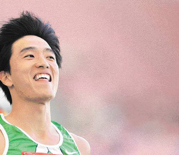 他就是在亚洲历史首次创造田径短距离男子110米跨栏项目世界纪录(12秒88)的“黄色炮弹”刘翔(23岁,中国,照片)。