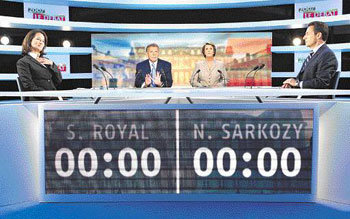 面对6日法国最后大选,2日在巴黎近郊的布伦比扬古尔特别摄影棚举行了一场电视讨论会。坐在画面右侧的是右派人民运动联盟候选人尼古拉·萨尔科齐,左侧的是左派社会党候选人罗雅尔。两人相隔2米,正在准备发表讲话。为了给两位候选人同样的时间而设置的大型时钟引人注目。当天的讨论会进行了约2小时40分,据统计约有2000万人观看。