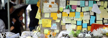 在三年级学生开课之后,28日韩国安山市檀园高中一二年级的学生们也陆续回学校上课。在学校的柱子上贴满了追悼遇难者,希望失踪者平安归来的祈福纸条。