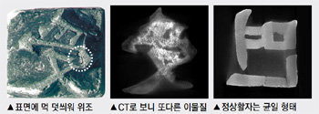 国立科学调查研究所的金属CT检测结果还发现,7个活字的横向和纵向剖面上存在着均匀围绕在其外廓的另一个断层。也就是,活字外部,围绕着与其密度不同的其他物质。国立科学调查研究所研究员姜泰易(音)表示,“因为在制造金属活字的时候,不会单独制作活字的里外层,正常情况下不会出现这样均匀的双重断层。”“预计,这是为了捏造金属活字数在历经数百年后像被腐蚀一样(的效果),在其表明裹上其他物质。”