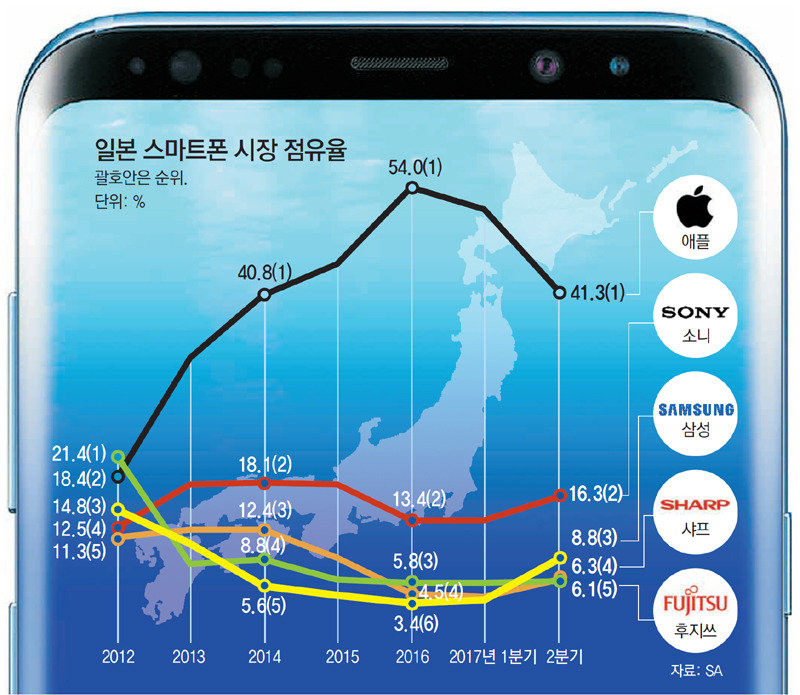 8日,据美国市场调查机构Strategy Analytics(SA))透露,三星电子在日本市场上,第二季度卖出了约70万部智能手机,以销量为准,创下了8.8%的占有率。这比前一季度(1 ~ 3月)的3.8%上升了5个百分点。排名也从第5位超过富士通和夏普,跃居第三位。第1名是苹果,第2名是索尼。