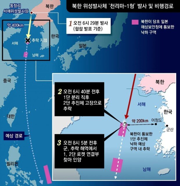 朝鲜5月31日在平安北道铁山郡东仓里西海卫星发射场发射的伪装成“宇宙运载火箭”的远程弹道导弹坠落在全罗北道群山市於青岛以西200多公里的海上。这里距离发射地点直线距离约400公里,是西部海域韩中暂定措施水域。据悉,当初朝鲜向日本海上保安厅和国际海事组织通报的一级推进器预计坠落区域(忠清南道大川港西南方向最远300公里处)也未能到达。