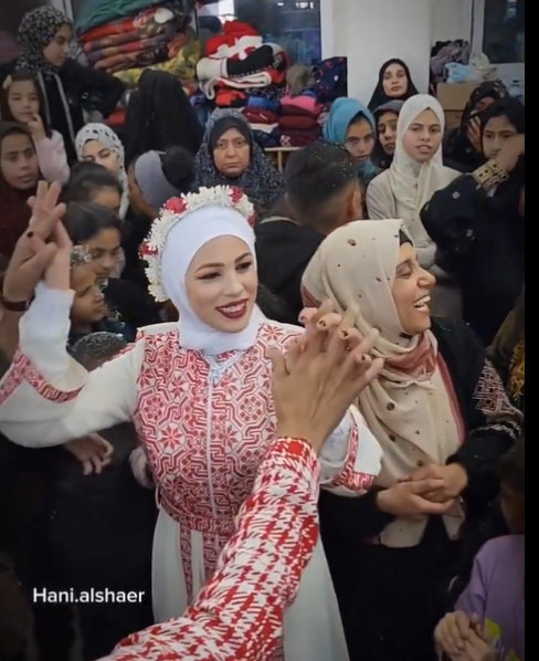 AFP에 따르면 라파 역시 매일 이스라엘의 공습을 받아 위험하기 짝이 없다. 하지만 신부 아프난은 새하얀 드레스를 입고 화관을 쓴 채 가족과 친구들의 축하를 받으며 등장했다. 신랑과 신부는 춤을 추며 결혼식을 만끽했고, 하객들은 하얀 무스를 뿌리며 그들을 축하했다.