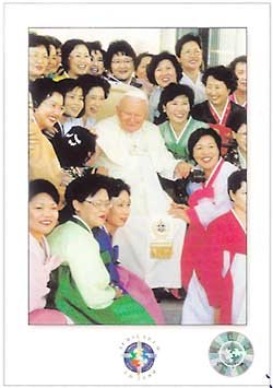 罗马天主教教皇厅最近发行了天主教汉城大教区韩国殉教者悼念会合唱团员们穿着民族服装在圣彼得广场拜见教皇的状况登在了两千年千喜年的纪念挂历上.