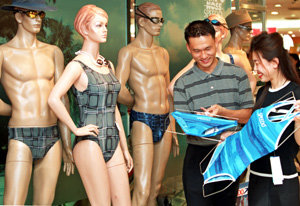 ‘情侣得穿情侣泳装’汉城现代百货新村店截止到23日举行‘情侣泳装打折活动’,对男女泳装一律五折酬宾.参加此项活动的有五家著名泳装品牌公司.