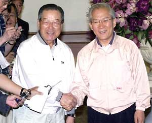 自民联名誉总裁金鐘泌和大国家党总裁李会昌于22日,在京畿道龙仁某高尔夫球场见面,热情的相互握手。