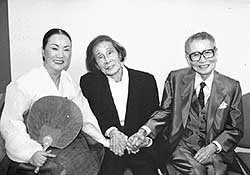 韩、日两国歌舞团的代表人士在日本横滨会晤,并关于两国的舞蹈进行了交谈。从左依此为:‘唱舞会’的金梅子,日本舞蹈‘浮土’创始人大野一雄,元老作曲家高木东六。