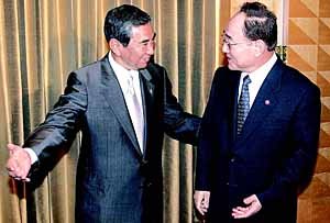 外交通商部部长李廷彬和日本外相河野洋平26日在曼谷韩日外长会谈前正高兴的打着招呼。