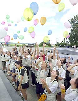 在南北韩部长级会谈结束,北方代表团回去后的31日,在京畿坡州临津阁,庆熙大学48名国土巡礼团团员将满载愿望的信装入气球,飞上天空.