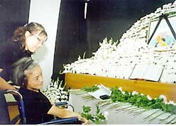 与已故波斯.霍尔特女士共度一生的精神及肢体残疾人金英姬(50岁),坐在轮椅上,把从霍尔特女士处收到的礼物收音机、信件及花献给她,并表示哀悼。