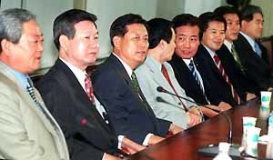 4日上午在汉城市汝夷岛民主党办公大楼会议室里,准备参加最高委员竞选的预备人员,召开恳谈会,决心进行公正的竞选。