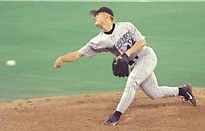 金炳宪在12日的远征比赛中,以动感的投球姿势.正有力地投球.黄头发和摇摆地项链,使他放出异彩.