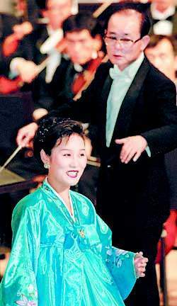 朝鲜国立交响乐团于周日,在汉城市汝矣岛洞KBS大厅里,举行了分裂后首次公开演出。北韩女高音歌手李香淑(前面)在金炳华指挥的乐团伴奏下演唱着北韩歌曲‘山茶花’.朝鲜国立交响乐团截止到22日,进行两次单独公演和两次与KBS交响乐团共同演出.