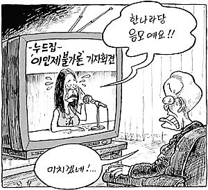 电视画面:(装扮成因裸体集大成为焦点的金喜善)李仁济道‘这是大国家党的阴谋.’