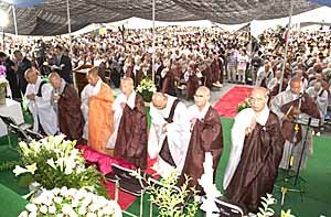 参加无遮大法会的僧侣和信徒们在佛像前朝拜无遮法大会法大会:是僧侣和一般信徒们无拘无束地进行讨论的法会的一种.