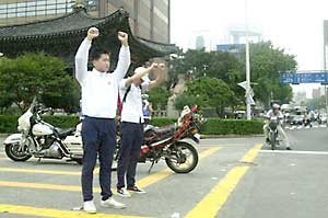 1日下午在光华门十字路口2个没戴头盔骑摩托车的高中生面向道路举手罚站,他们正接受令他们丢尽面子的惩罚.