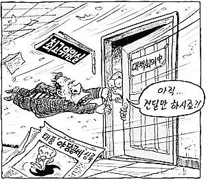 情景: 在举行关于最新宪法案对策会议的民主党最高委员室门口,金大中总统勉强立住, 可以看见报纸上的头条新闻"`在野党的攻击`台风上陆"
