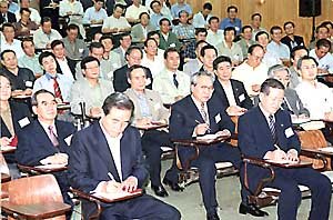 2日下午, 参加在京畿道果川中央公务员教育院召开的高层公职人员特别研钻会的李汉东国务总理等高层公职人员在倾听金大中总统的特别讲演.