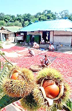 星期一下午在仁川市江华岛江华邑河道里的一农家里, 大家正晒忙着辣椒, 熟透的栗子啧地一声裂开, 人们感觉到秋天真的来了.