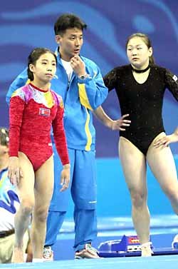 韩国女子体操选手崔美善(右)和李允哲教练(中间)于14日在奥林匹克公园内体操场上与北韩选手们一起进行训练.