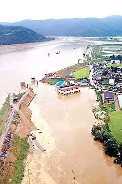 因15日的暴雨, 庆北高灵乐东江的堤坝被冲垮, 卷带着黄土的江水汹涌澎湃.