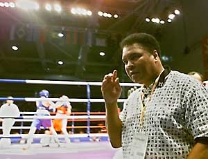 16日, 前重量级拳击冠军穆罕默德·阿里(美国)来到了正在举行拳击比赛的悉尼展览中心, 当现场播音员介绍他的到来时, 他的崇拜者们报以热烈的欢呼声, 阿里向他们致谢.
