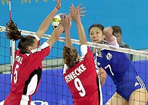 在女子排球第二轮比赛中,韩国队选手朴美庆(右边)在德国队的拦网下,强有力的扣球.