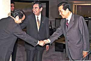 金大中总统22日下午在下榻的宾馆接见日本外相河野洋平(中间)等日方一行.